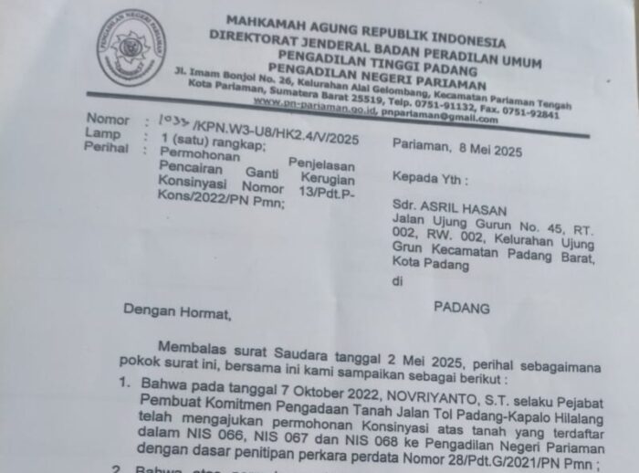 “Dalam surat tersebut juga disebutkan bahwa tanggal 10 Oktober 2024, Panitera Pengadilan Negeri Padang Pariaman telah menyerahkan uang ganti rugi atas tanah yang terdaftar dalam NIS 66, NIS 67 dan NIS 68 kepada Kuasa Hukum Asril Hasan yaitu H Mulyadi SH, MH, tanpa menyebutkan nilai rupiah yang diserahkan,” sebut Ryan, putra Asril Hasan di Padang, Minggu (06/7/2025).