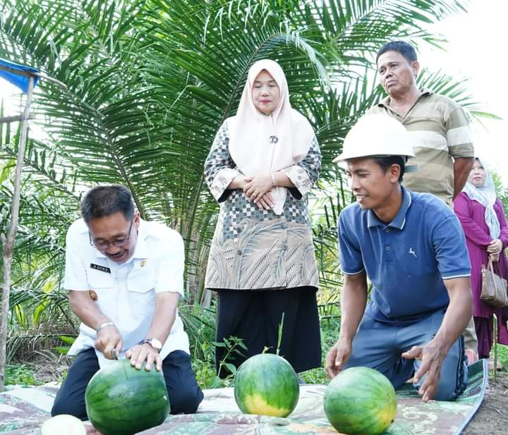 Bupati H. Edimin didampingi Ketua TP. PKK Ny. Hj. Darni berkesempatan memetik langsung buah semangka dan mencicipinya.