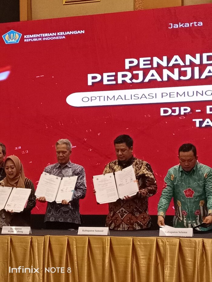 RADARINDO.co.id – Samosir : Bupati Samosir, Vandiko Timotius Gultom bersama Direktorat Jenderal Pajak (DJP) dan Direktorat Jenderal Perimbangan Keuangan (DJPK) melakukan penandatangan Perjanjian Kerja Sama (PKS) optimalisasi pemungutan pajak pusat dan daerah. Penandatangan PKS Tripartit ini dilakukan di Aula Cakti Buddhi Bakti (CBB) Kantor Pusat Dirjen Pajak, Jalan Gatot Subroto Kav. 40-42, Jakarta, Selasa (22/8/2023).