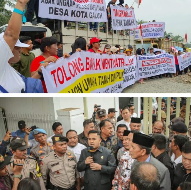 RADARINDO.co.id – Sergai : Ratusan warga Desa Kota Galuh, Kecamatan Perbaungan, Kabupaten Serdang Bedagai (Sergai) yang tergabung dalam Forum Perjuangan Tanah Kota Galuh menggelar aksi damai di Pengadilan Negeri (PN) Seirampah dan DPRD Sergai, Rabu (15/5/2024).