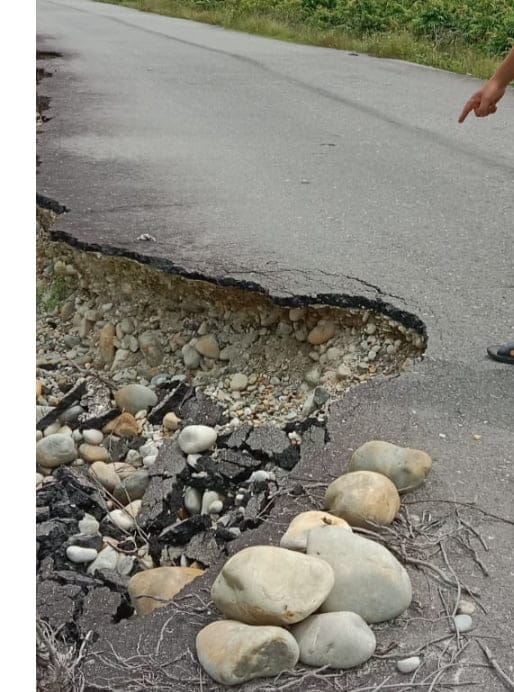 Dari pantauan, Jum’at (05/5/2023) dilokasi, terlihat jalan aspal yang sebelumnya dibangun oleh pemerintah, kini mulai tampak retak dan terancam amblas.
