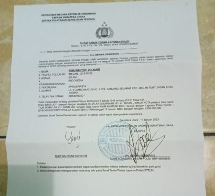 “Kanit 5 Subdit 1 Kamneg Ditreskrim Polda Sumut, AKP AN sudah saya laporkan ke Propam Polri melalui WA Yanduam Propam Polri. Dia bersikap arogan saat ditemui dan mengabaikan bukti-bukti dalam laporan pasal 421 KHUP,” ujar Yanti, Sabtu (08/7/2023).