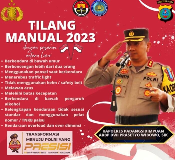 RADARINDO.co.id – Psp : Mulai Juni 2023, jajaran Sat Lantas Polres Padang Sidempuan akan kembali berlakukan tindakan langsung (tilang) manual. Pemberlakuan tilang manual oleh Sat Lantas Polres Padang Sidempuan itu, setelah keluarnya surat telegram dari Kapolri, Jenderal Pol Listyo Sigit Prabowo bernomor : ST/830/IV/HUK.6.2./2023 pada 12 April lalu.