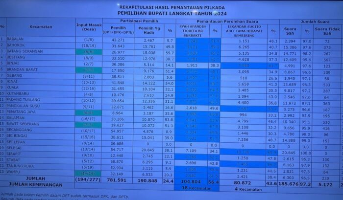 Dari hitung cepat yang dibuat tim pemenangan SATRIA, calon Bupati nomor urut 01, unggul di Kecamatan Batang Serangan, Berandan Barat, Babalan, Hinai, Kuala, Pangkalan Susu, Pematang Jaya, Secanggang, Tanjung Pura dan Kecamatan Wampu.