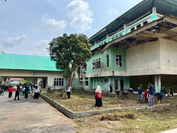 Pembersihan dilakukan mulai pekarangan, saluran drainase, pelataran, hingga ruangan dalam gedung. Kegiatan ini dilakukan secara bertahap, mulai dari pengangkatan puing dan sampah, pembersihan saluran drainase dan penebangan/pemotongan pohon agar lebih tertata rapi dan bersih.