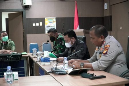 Dandim 0313 KPR Letkol Inf Leo Oktavianus memimpin Rapat Evaluasi terkait penjadwalan Pemilihan Kepala Desa (Pilkades) serentak bergelombang beryempat di ruang rapat Lantai III Kantor Bupati Kampar, Jum’at (12/11/2021).