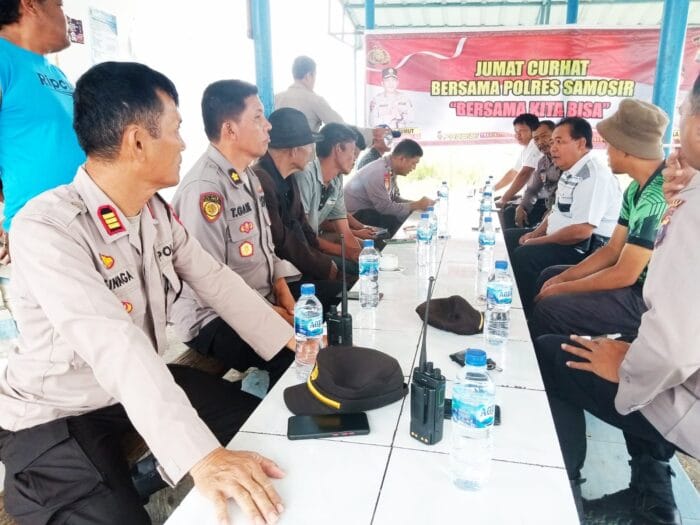 Pejabat Utama Polres Samosir dalam melaksanakan kegiatan Program Jumat Curhat dan bertatap muka dengan masyarakat setpat di pelabuhan Mongang Desa Pallombuan Kecamatan Palipi Kabupaten Samosir.