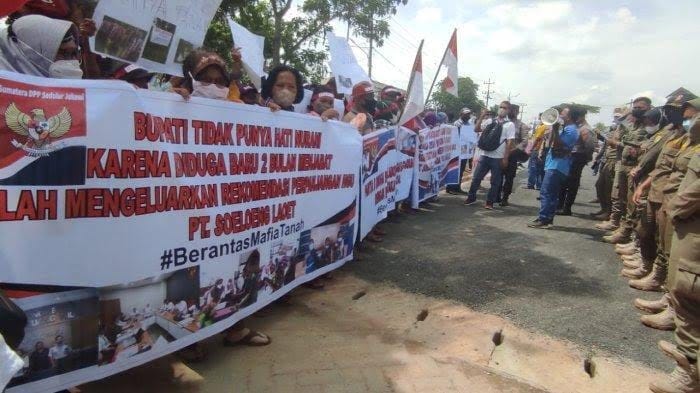 Para kelompok tani membawa spanduk dan kertas karton dengan berbagai tulisan ‘Bupati tidak punya hati nurani karena diduga baru dua bulan menjabat telah mengeluarkan rekomendasi perpanjangan HGU PT Soeloeng Laoet’ dan ‘tangkap mafia tanah’.