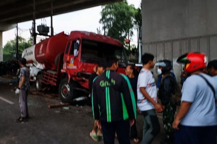 Akubat insiden Lalin di jalan Raya Artenatip Transyogi Cibubur depan CBD RT 01 RW 1 Kel Jatirangga, kec Jatisampurna, kota Bekasi Mobil Trek Pertamina tabrakan menawaskan 15 orang diantaranya anggota TNI AL.