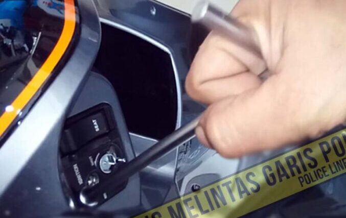 Pria itu tampak memantau situasi. Setelah dirasa aman, pria tersebut langsung melakukan aksinya menaiki sepedamotor putih itu. Saat melancarkan aksinya membongkar lubang kunci motor itu, sepasang suami istri yang juga mengendarai motor tiba-tiba menghentikan aksi pria itu.