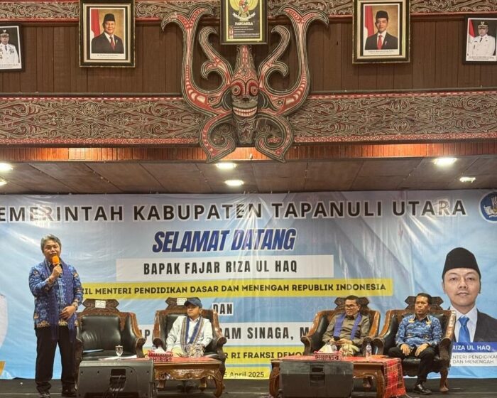 RADARINDO.co.id – Taput : Wakil Bupati (Wabup) Tapanuli Utara (Taput), Dr. Deni Parlindungan Lumbantoruan, M.Eng, menyambut kunjungan kerja (Kunker) Wakil Menteri (Wamen) Pendidikan Dasar dan Menengah, Dr. Fajar Riza Ul Haq, M.A., bersama anggota Komisi X DPR RI, Sabam Sinaga, dalam acara ramah tamah di Gedung Sopo Partungkoan, Tarutung, Jum’at (25/4/2025).
